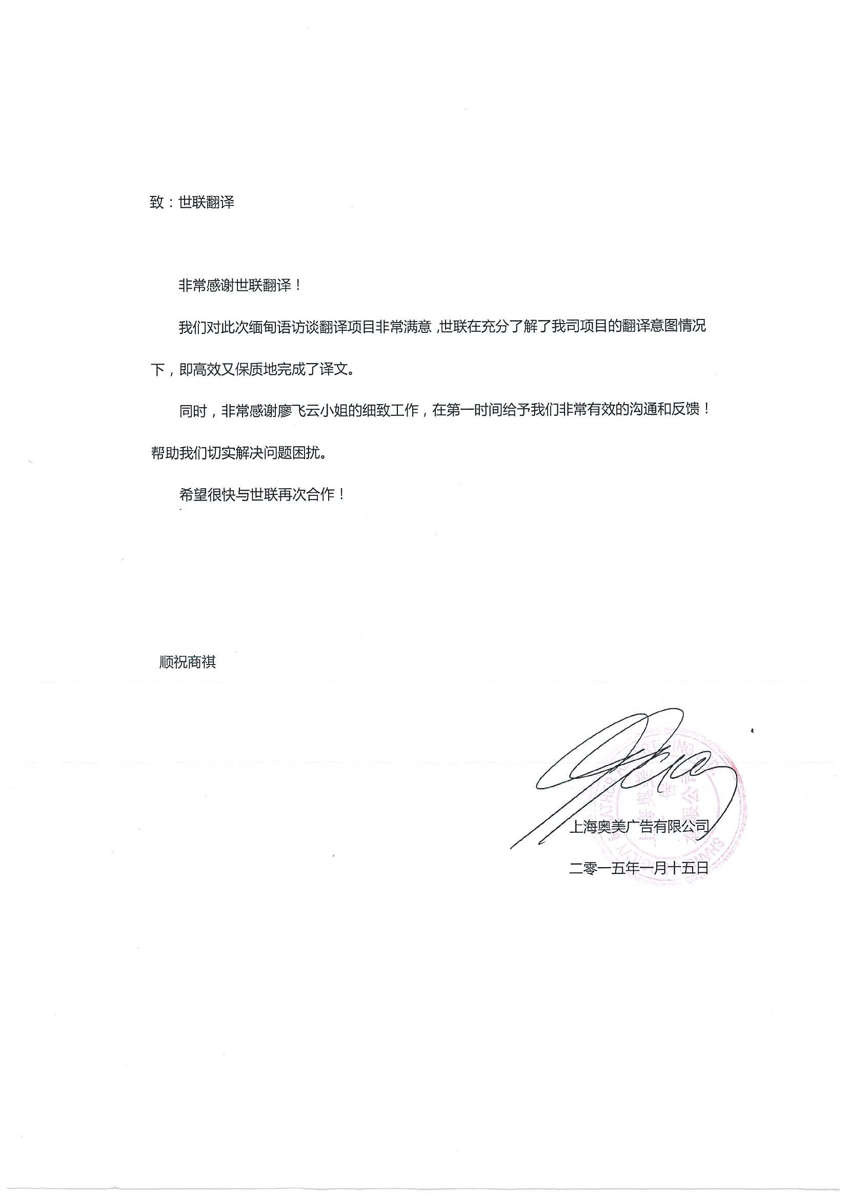 “非常感謝世聯(lián)翻譯!我們對此次緬甸語訪談翻譯項(xiàng)目非常滿意,世聯(lián)在充分了解我司項(xiàng)目的翻譯意圖情況下,即高效又保質(zhì)地完成了譯文�!�