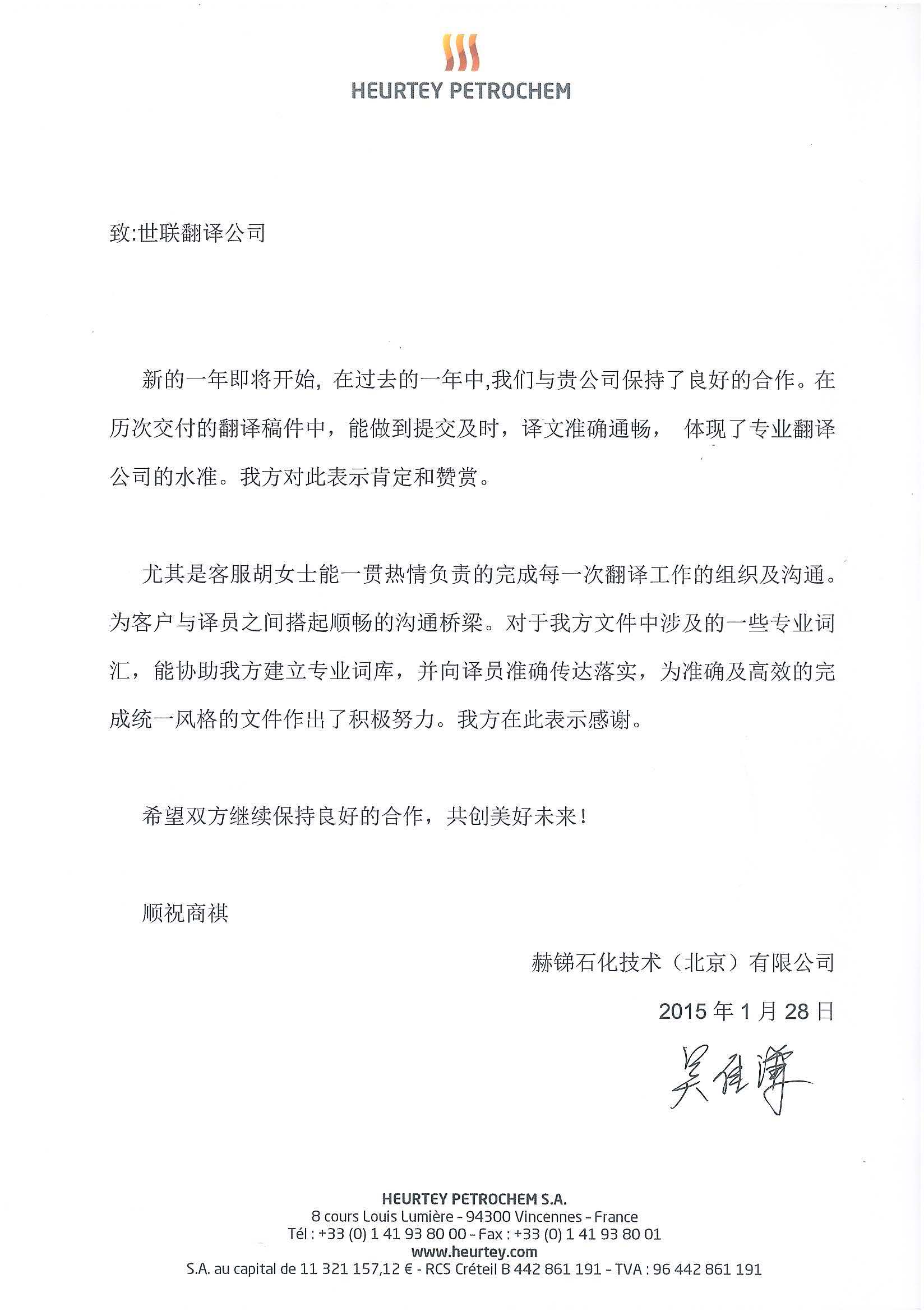 “我司在2014年與貴公司建立合作關(guān)系,貴公司的翻譯服務(wù)質(zhì)量高、速度快、態(tài)度好,贏得了我司各部門的一致好評(píng)。貴司經(jīng)理工作認(rèn)真踏實(shí),特此致以誠摯的感謝!”