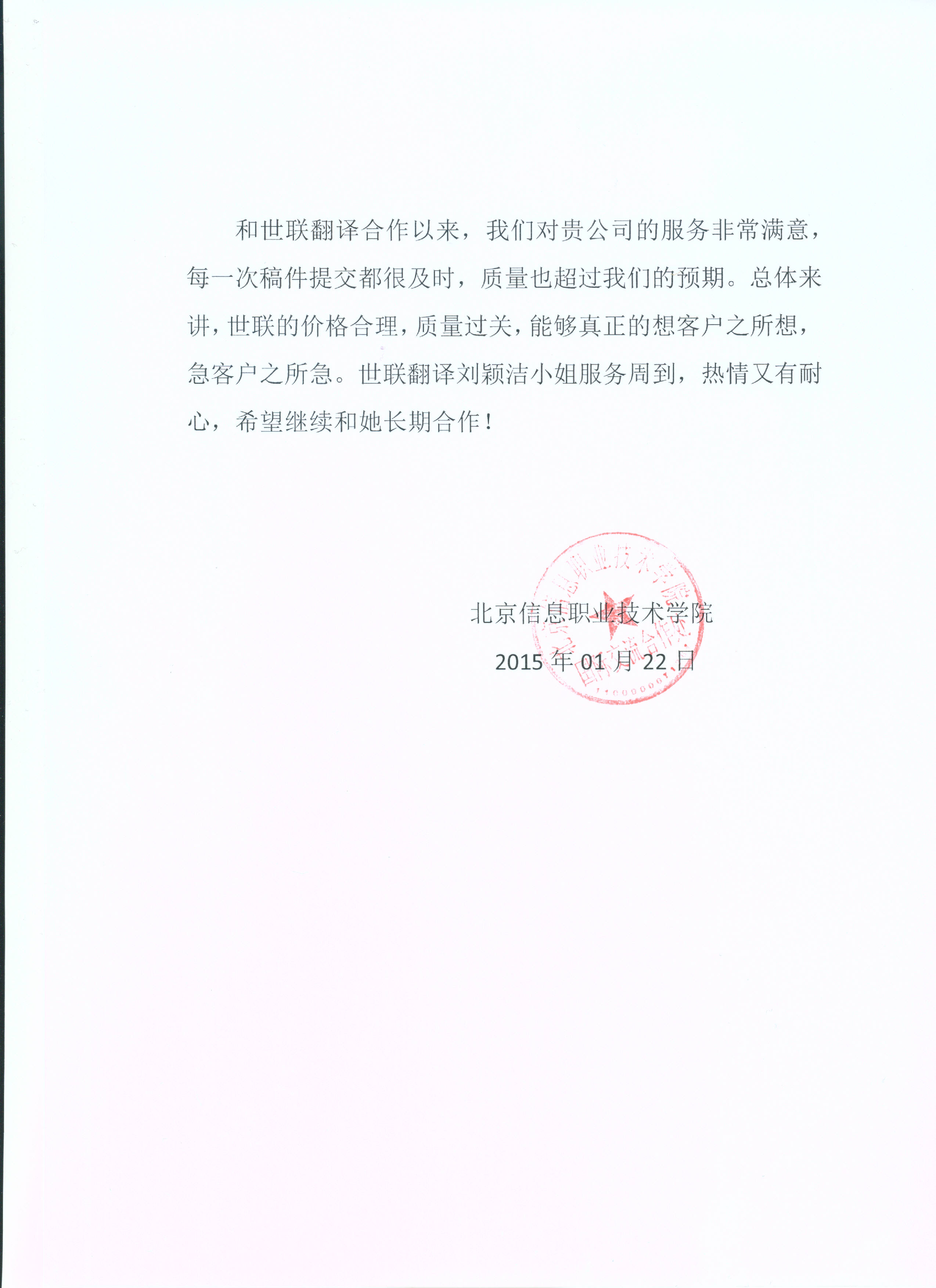 “我司在2014年與貴公司建立合作關(guān)系,貴公司的翻譯服務(wù)質(zhì)量高、速度快、態(tài)度好,贏得了我司各部門(mén)的一致好評(píng)。貴司經(jīng)理工作認(rèn)真踏實(shí),特此致以誠(chéng)摯的感謝!”