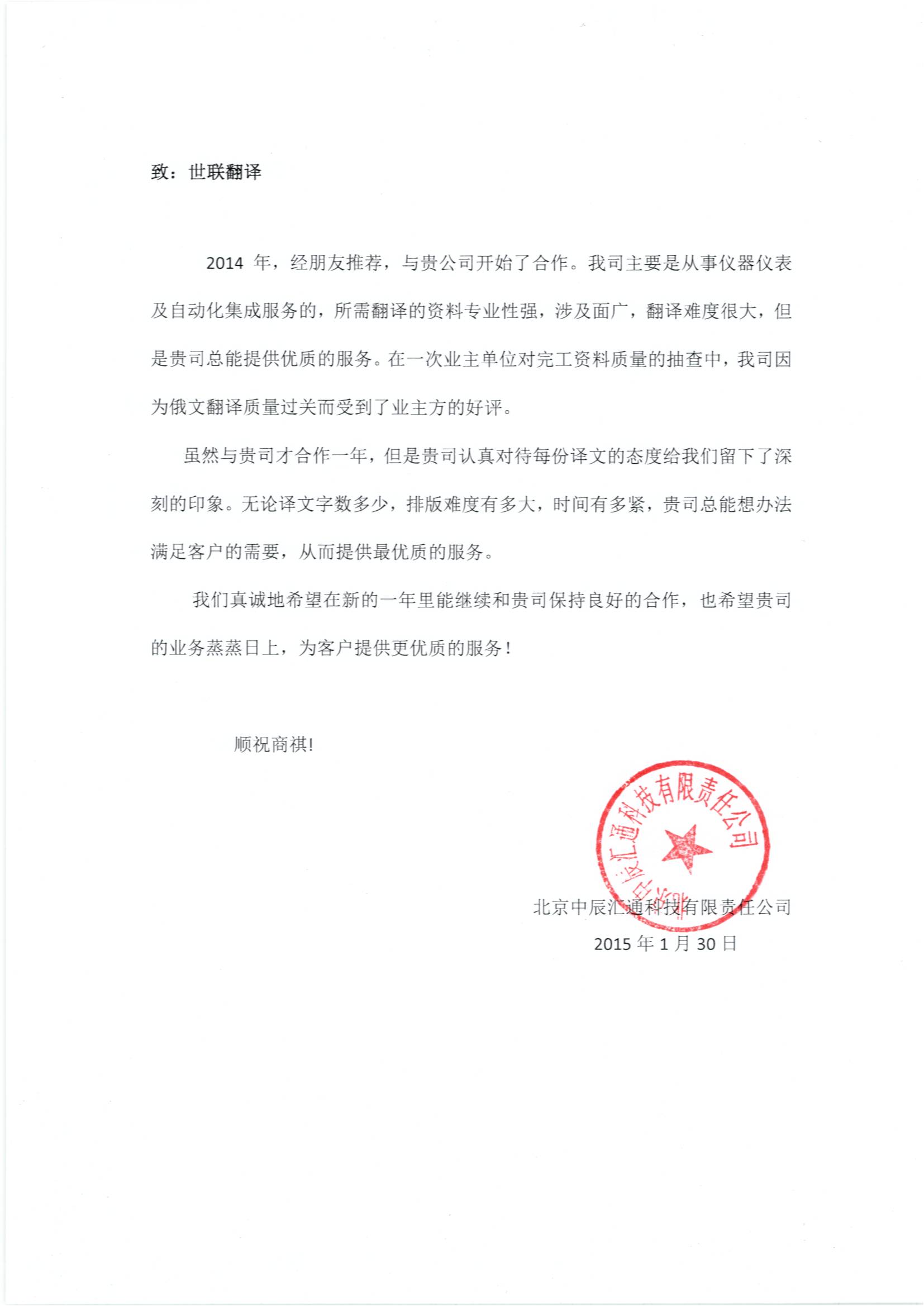 “我司在2014年與貴公司建立合作關(guān)系,貴公司的翻譯服務(wù)質(zhì)量高、速度快、態(tài)度好,贏得了我司各部門(mén)的一致好評(píng)。貴司經(jīng)理工作認(rèn)真踏實(shí),特此致以誠(chéng)摯的感謝!”
