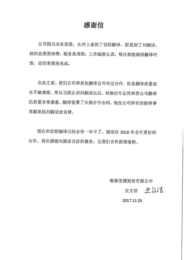 銀泰資源股份有限公司致世聯(lián)翻譯的一封信