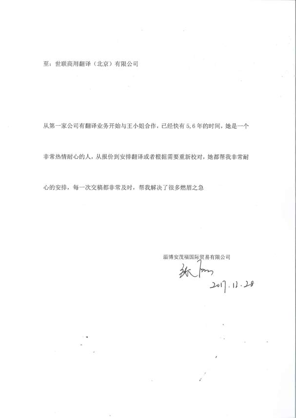“我司在2014年與貴公司建立合作關(guān)系,貴公司的翻譯服務(wù)質(zhì)量高、速度快、態(tài)度好,贏得了我司各部門的一致好評(píng)。貴司經(jīng)理工作認(rèn)真踏實(shí),特此致以誠(chéng)摯的感謝!”