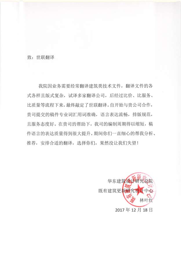 我院因業(yè)務(wù)需要經(jīng)常翻譯建筑類技術(shù)文件,翻譯文件的各 式各樣且版式復(fù)雜,試譯多家翻譯公司,后經(jīng)過比價(jià)、比服務(wù)、比質(zhì)量等流程下來,最終敲定了世聯(lián)翻譯。自開始與貴公司合作, 貴司提交的稿件專業(yè)詞匯用詞準(zhǔn)確,語言表達(dá)流暢,排版規(guī)范, 且服務(wù)態(tài)度好。在貴司的幫助下,我司的編制周期得以縮短,稿件語言的表達(dá)質(zhì)量得到很大提升。期間你們一直細(xì)心的幫我分析、 推薦,安排合適的翻譯,選擇你們,果然沒讓我們失望!