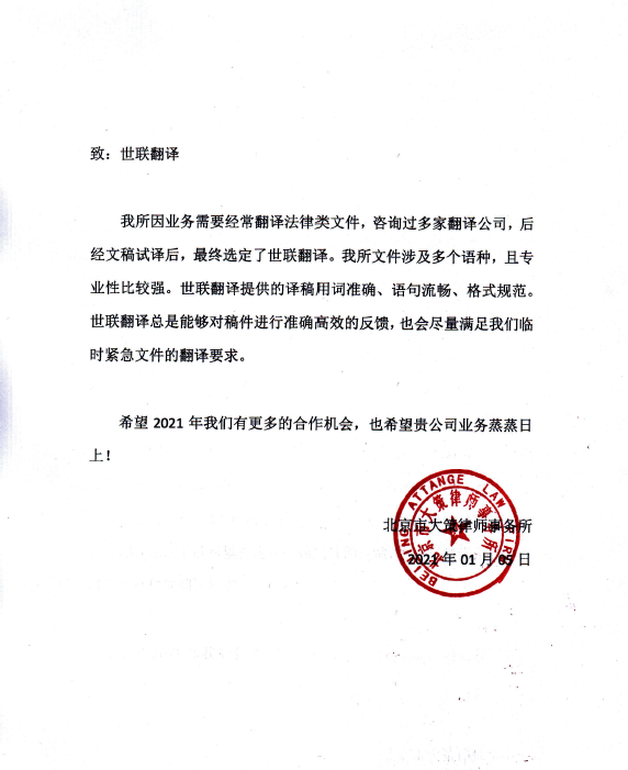 “我司在2014年與貴公司建立合作關(guān)系,貴公司的翻譯服務(wù)質(zhì)量高、速度快、態(tài)度好,贏得了我司各部門的一致好評(píng)。貴司經(jīng)理工作認(rèn)真踏實(shí),特此致以誠(chéng)摯的感謝!”
